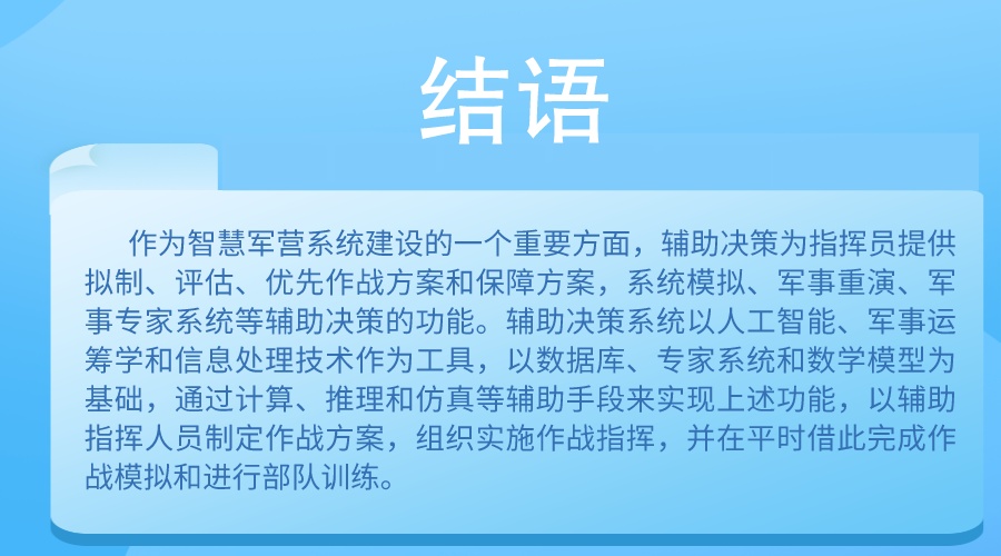 辅助决策的核心问题是拟制相对决策方案,帮助指挥员定下战斗决心。根据作战时机通过人机交互的方式辅助指挥员完成作战方案的生成和评估。具体有以下内容:目标整体分析军事目标打击方案生成目标威胁分析目标信息数据库武器装备数据库。作战指挥决策是作战行动的基础,正确的行动来源于正确的决策。指挥决策任务制定作战行动计划,其目的是提高军队指挥效能,最大限度发挥部队集体战斗力。智慧军营作战辅助决策系统通过现代作战理论指导,综合运用现代电子信息技术和设备,与作战指挥人员紧密结合的人机交互系统,对部队人员和武器实施指挥与控制。